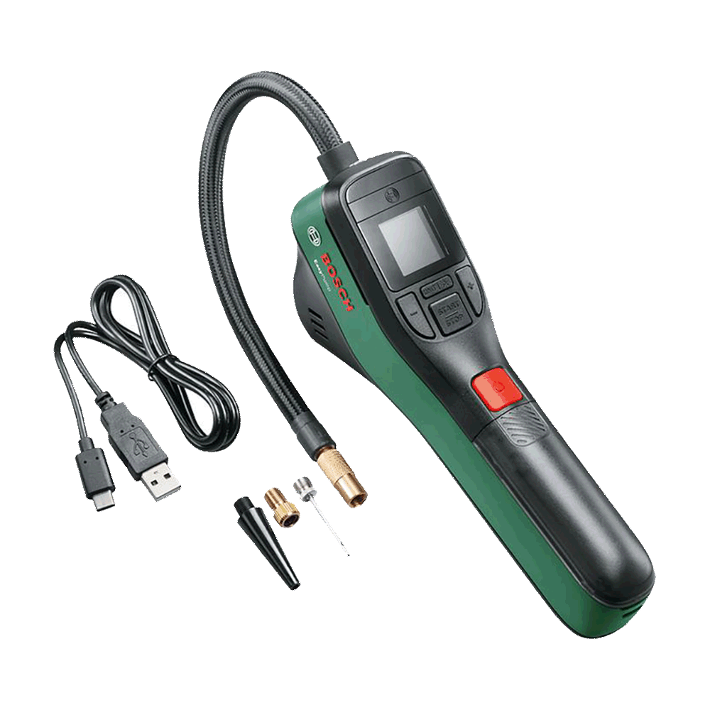 Kleines Geraet mit grosser Leistung: Die EasyPump ist Boschs intuitive Druckpumpe fuer alle Anwendungen bis 10,3 bar. Die Echtzeitmessung und die Vorwahlfunktion sorgen fuer Komfort und genaue Befuellergebnisse. Die Pumpe verfuegt ueber ein klares Bedienfeld und ein grosszuegiges Display, das auch bei Tageslicht gut ablesbar ist. Ihr leichtes und handliches Design macht sie zum idealen Begleiter. Die EasyPump ist mit verschiedenen Adaptern ausgestattet, die im Staufach ordentlich aufbewahrt sind. Sie kann alle Reifenarten, z. B. vom Auto oder Fahrrad), Baelle, z. B. Fussbaelle, und sogar kleine Wassersportartikel aufpumpen. Noch nie war Aufpumpen so einfach.