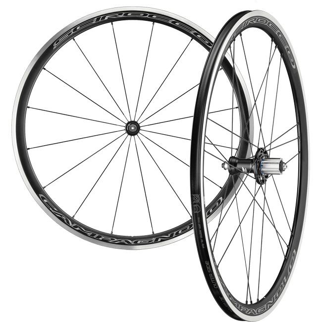 Die Anzahl der Aero – Speichen, jetzt mit geradem Kopf und konifiziertem Querschnitt 2 – 1,6 – 2, wurden am Vorderrad auf 16 Speichen und am Hinterrad auf 21 reduziert. Das Vorderrad ist radial eingespeicht. Fuer das Hinterrad wird das patentierte Campagnolo- Einspeichsystem 2:1 Two – to – One Spoke Ratio angewendet.