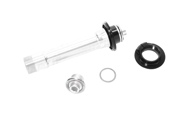 Die Austauschachse fuer die Campagnolo Shamal und Boda Disc Laufraeder zum Umruesten des Vorderrades auf Schenllspann Montage.