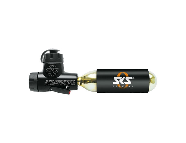 Der AIRBUSTER ist die extrem leichte Loesung fuer jeden Wettkampf. Die CO2-Pumpe besteht aus einem Aluminium-Gehaeuse mit integriertem Druckdosierventil, Kaelteschutz und Staubschutzkappe. Sie eignet sich fuer Kartuschen mit Gewinde. Ueber einen Drehdosierer kann der Druck leicht reguliert werden. Zum Lieferumfang gehoeren eine 16g-Ersatzkartusche und der bewaehrte SKS-2-Punkt-Pumpenhalter.