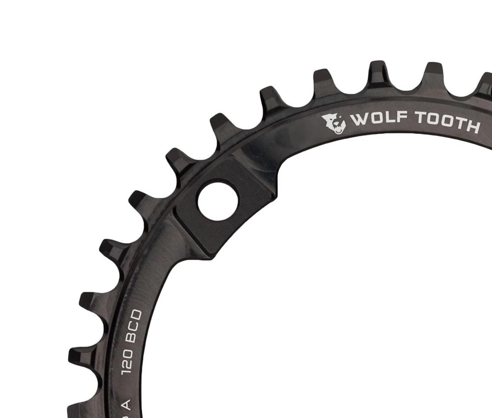 Das patentierte Drop Stop A Narrow-Wide-Zahnprofil von Wolf Tooth bietet die ultimative Kettenfuehrung und Selbstreinigung. Die rechte Seite des Zahns ist so breit wie moeglich, um die Kontaktflaeche zur Kette zu maximieren. Mehr Kontaktflaeche bedeutet, dass die Belastung auf einer groesseren Flaeche verteilt wird, was wiederum den Verschleiss reduziert. Die linke Seite des Zahns ist schmaler als der Rollenstift der Kette, darum hat Wolf Tooth zusaetzliches Material entfernt, um einen Kanal zu schaffen damit Schmutz abfliessen kann. Mehr Kontaktflaeche und Platz bedeutet wiederum eine geringere Wahrscheinlichkeit das die Kette beim fahren durch Schmutz herunterfaellt.