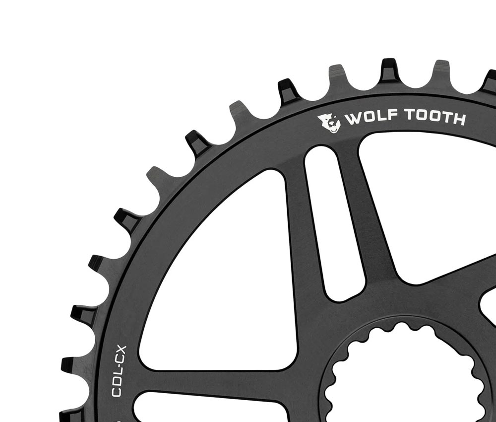 Das patentierte Drop Stop B Narrow-Wide-Zahnprofil von Wolf Tooth bietet die ultimative Kettenfuehrung und Selbstreinigung. Die rechte Seite des Zahns ist so breit wie moeglich, um die Kontaktflaeche zur Kette zu maximieren. Mehr Kontaktflaeche bedeutet, dass die Belastung auf einer groesseren Flaeche verteilt wird, was wiederum den Verschleiss reduziert. Die linke Seite des Zahns ist schmaler als der Rollenstift der Kette, darum hat Wolf Tooth zusaetzliches Material entfernt, um einen Kanal zu schaffen damit Schmutz abfliessen kann. Mehr Kontaktflaeche und Platz bedeutet wiederum eine geringere Wahrscheinlichkeit das die Kette beim fahren durch Schmutz herunterfaellt.