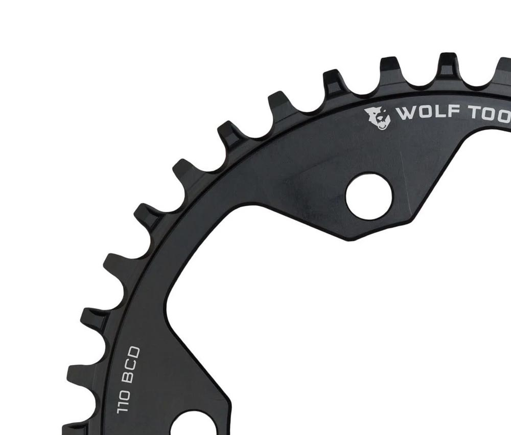 Das patentierte Drop Stop B Narrow-Wide-Zahnprofil von Wolf Tooth bietet die ultimative Kettenfuehrung und Selbstreinigung. Die rechte Seite des Zahns ist so breit wie moeglich, um die Kontaktflaeche zur Kette zu maximieren. Mehr Kontaktflaeche bedeutet, dass die Belastung auf einer groesseren Flaeche verteilt wird, was wiederum den Verschleiss reduziert. Die linke Seite des Zahns ist schmaler als der Rollenstift der Kette, darum hat Wolf Tooth zusaetzliches Material entfernt, um einen Kanal zu schaffen damit Schmutz abfliessen kann. Mehr Kontaktflaeche und Platz bedeutet wiederum eine geringere Wahrscheinlichkeit das die Kette beim fahren durch Schmutz herunterfaellt.