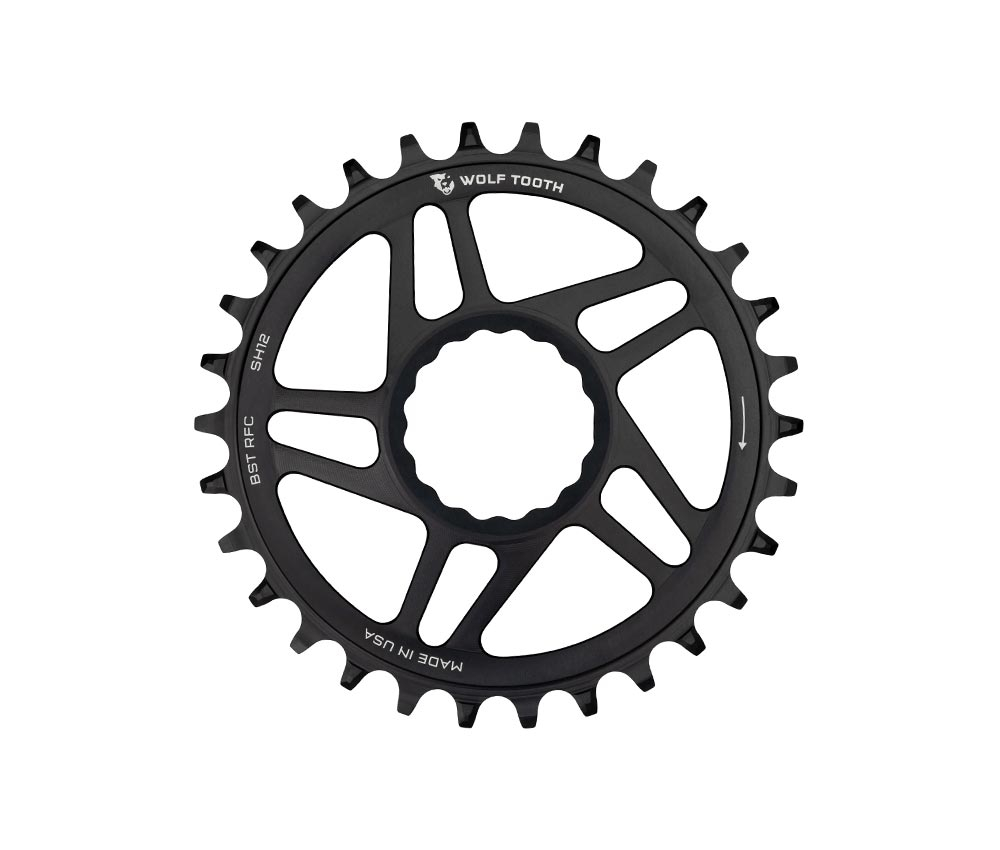 Das patentierte Drop Stop ST Narrow-Wide-Zahnprofil von Wolf Tooth bietet die ultimative Kettenfuehrung und Selbstreinigung fuer Shimano HG+ 12-fach Ketten. Die rechte Seite des Zahns ist so breit wie moeglich, um die Kontaktflaeche zur Kette zu maximieren. Mehr Kontaktflaeche bedeutet, dass die Belastung auf einer groesseren Flaeche verteilt wird, was wiederum den Verschleiss reduziert. Die linke Seite des Zahns ist schmaler als der Rollenstift der Kette, darum hat Wolf Tooth zusaetzliches Material entfernt, um einen Kanal zu schaffen damit Schmutz abfliessen kann. Mehr Kontaktflaeche und Platz bedeutet wiederum eine geringere Wahrscheinlichkeit das die Kette beim fahren durch Schmutz herunterfaellt.