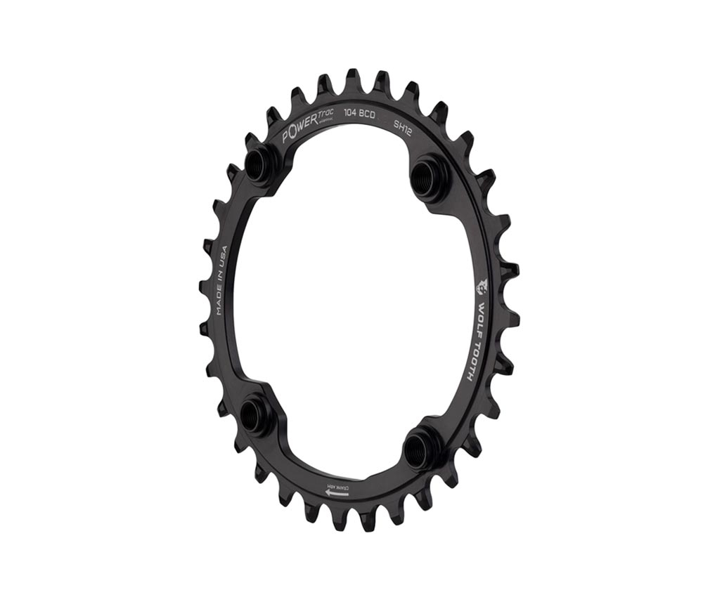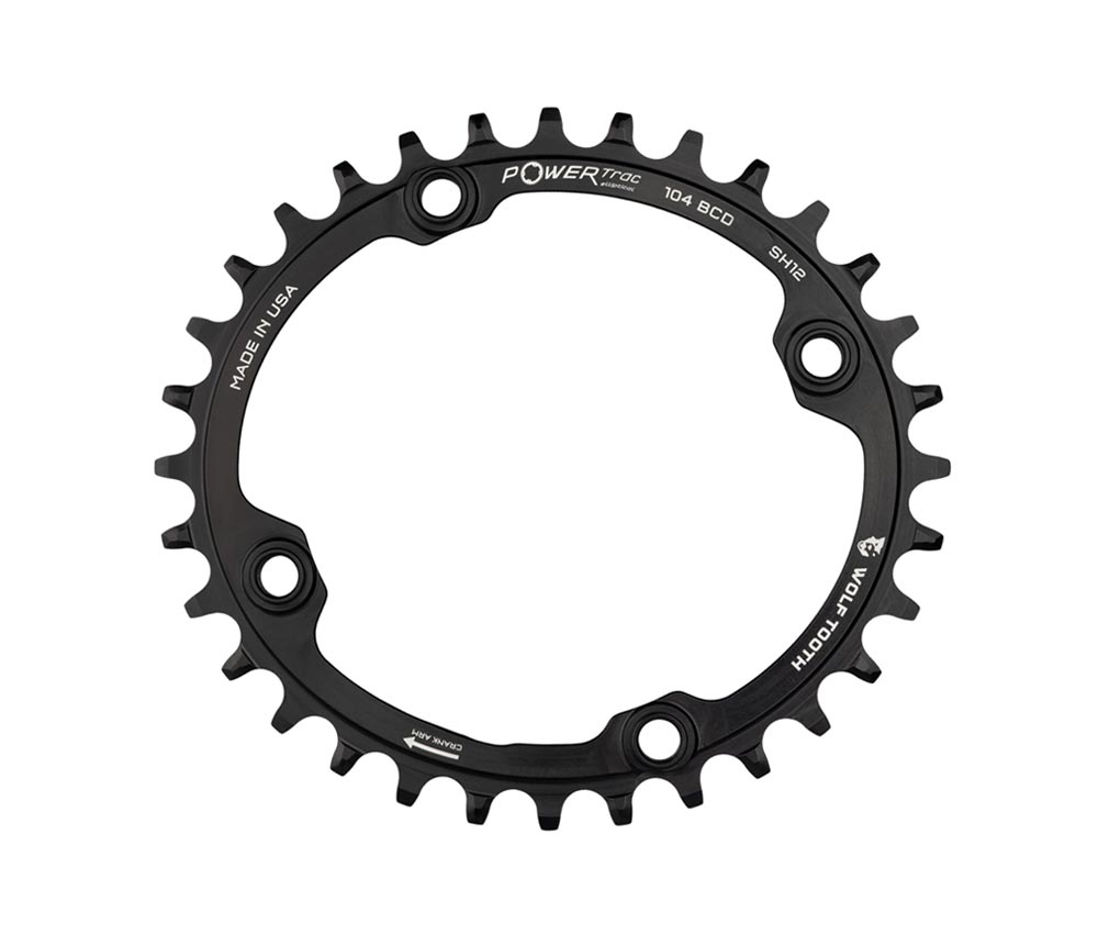 Das ovale 1-fach Kettenblatt wurde speziell fuer den Umbau von 2-3-fach Kurbeln mit symmetrischen 104 mm Lochkreis entwickelt. Damit lassen vorhandene Kettenblatt Kombinationen auf 1-fach Antrieb umruesten, was Gewicht spart und fuer eine aufgeraeumte Optik sorgt. Gefertigt wird das Kettenblatt aus hochfestem Aluminium 7075 T6, was es besonders halbar und leicht macht. Durch die Wolf Tooth PowerTrac Technologie ist das Kettenblatt 10 Prozent Oval und mit weniger aggressivem 112 Grad Timing ausgestattet. Es is mit allen 12-fach Shimano HG+ Ketten kompatibel.